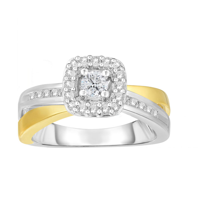 This fabulous engagement ring features a center diamond totaling approximately 1/4 carat. There are 26 side diamonds in a halo and along the band in I-J color, I1-I2 clarity. Total diamond weight is approximately 1/2 carat. This ring is in two tone sterling silver.