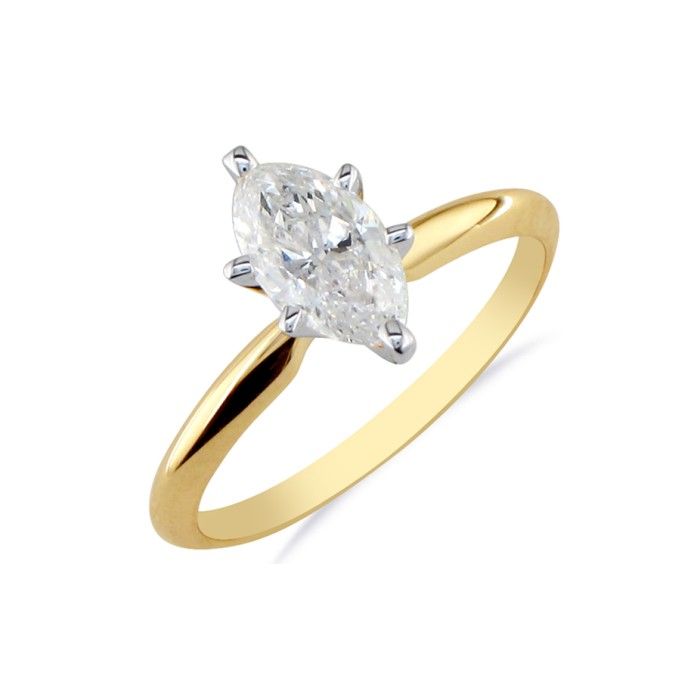 This classic solitaire ring features a 1/2 carat marquise shape diamond in H-I color, SI2-I1 clarity. This ring is in 14 karat yellow gold.