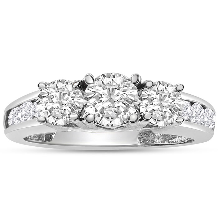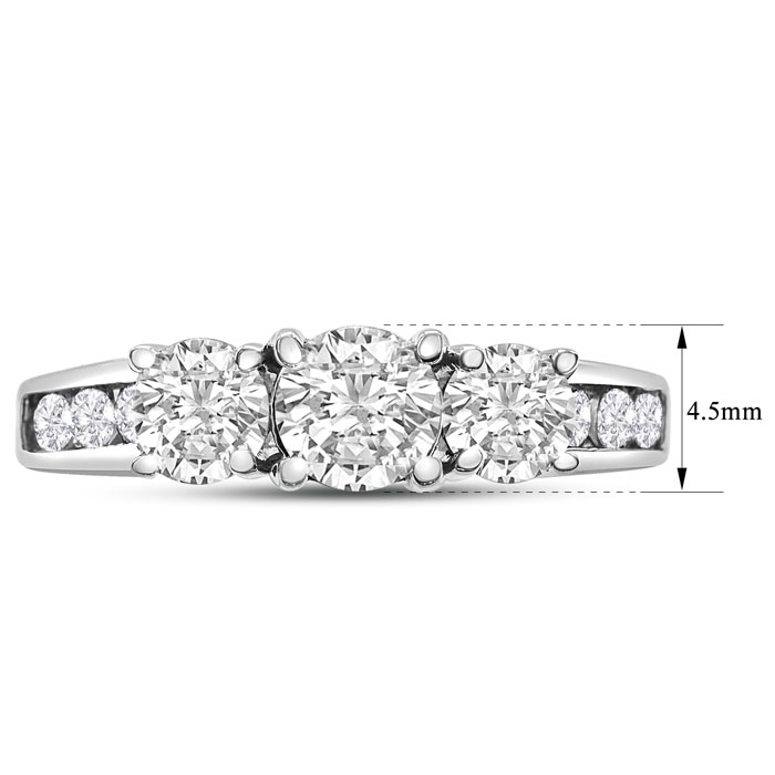 This diamond ring features a 3 stone design with the center diamond weighing 1/3 carats. There are 10 diamonds total in this ring weighing 1 carat. Diamond color is H-I, diamond clarity I1-I2. This ring is in 14 karat white gold.