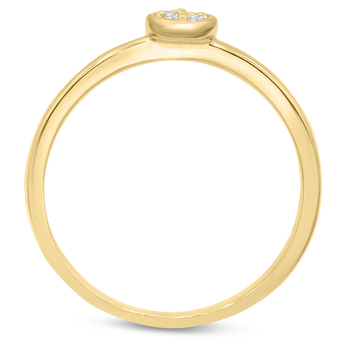 This promise ring features four sparkling diamonds in the center. Diamond color is J-K, diamond clarity is I2-I3. Total carat weight is 0.04 carat. This ring is in 10 karat yellow gold. Ring top measures 4.7mm in diameter.