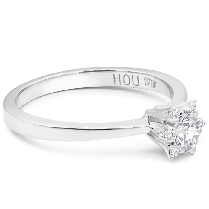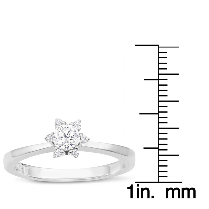 This promise ring features one sparkling diamond in the center at 1/4 carat. It is surrounded by 6 sparkling diamonds in a flower halo shape. Diamond color is J-K, diamond clarity is I1-I2. Total carat weight is 1/3 carat. This ring is in 10 karat white gold. Ring top measures 7mm in diameter.