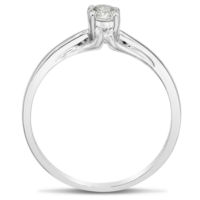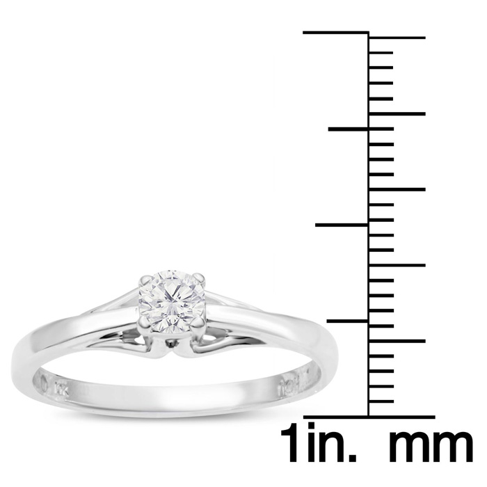This promise ring features 1 sparkling center diamond. Diamond color is J-K, diamond clarity is I1-I2. Total carat weight is 1/4 carat. This ring is in 10 karat white gold. Ring top measures 4mm in diameter.