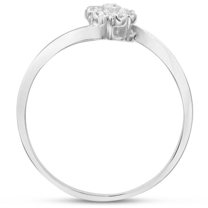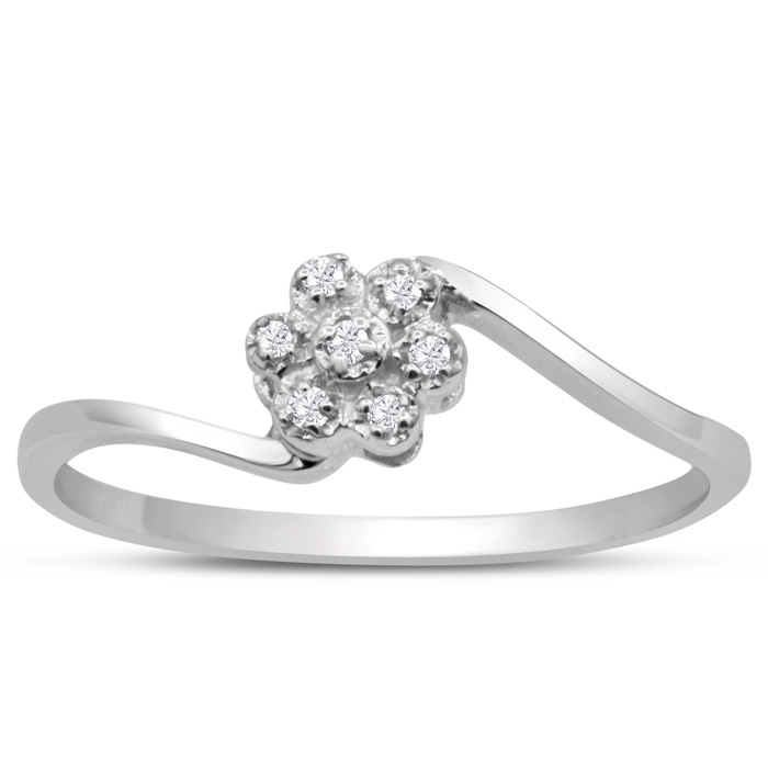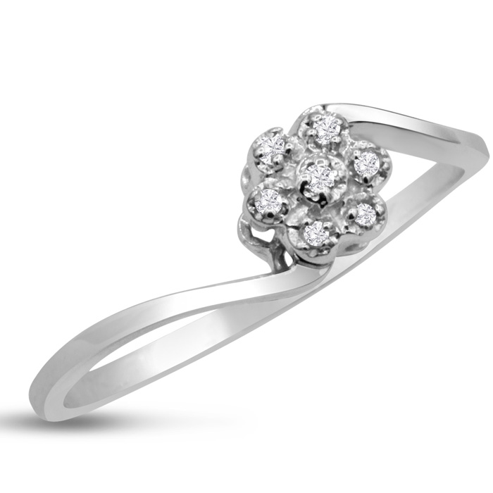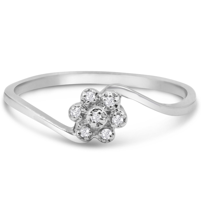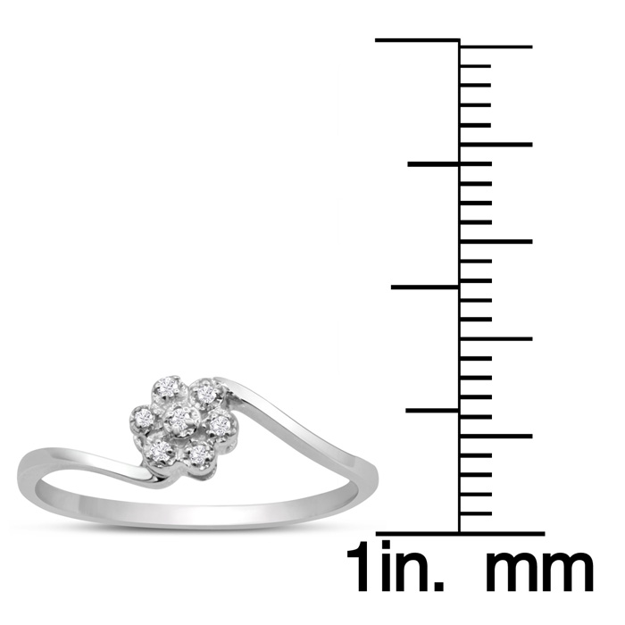 This promise ring features 7 sparkling diamonds in a flower shape. Diamond color is J-K, diamond clarity is I2-I3. Total carat weight is 0.04 carats. This ring is in 10 karat white gold. Ring top measures 5.5mm in diameter.