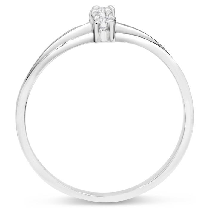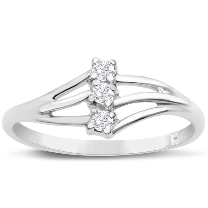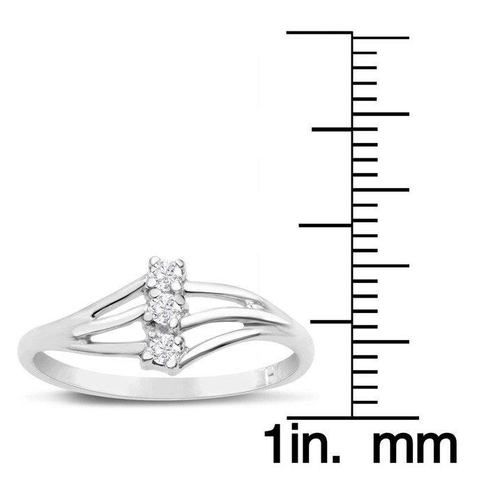 This promise ring features three sparkling diamonds in the center. Diamond color is J-K, diamond clarity is I2-I3. Total carat weight is 1/10 carat. This ring is in 10 karat white gold. Ring top measures 7mm long.