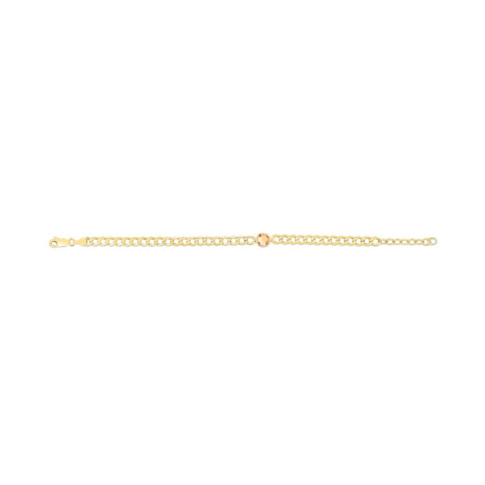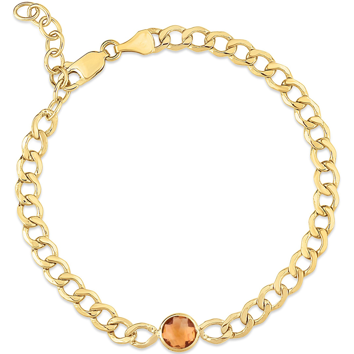 This citrine bracelet features one 6mm citrine gemstone. The bracelet is a 7.25" 3.6mm curb chain with a 1 inch extender and a lobster-claw clasp.
