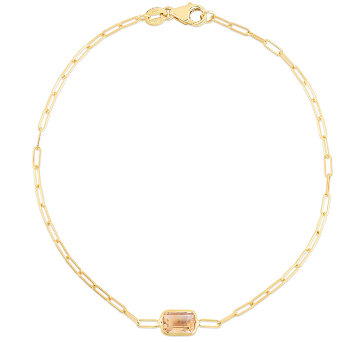 This citrine bracelet features one 6x4mm baguette citrine gemstone. The bracelet is a 7 inch 1.5mm paperclip chain with a lobster-claw clasp.