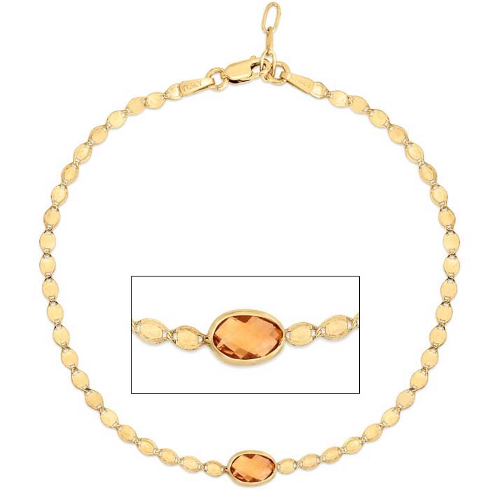 This citrine bracelet features one 6x4mm oval shape citrine gemstone. The bracelet is a 7.25" 2.2mm mirrored chain with a lobster-claw clasp.