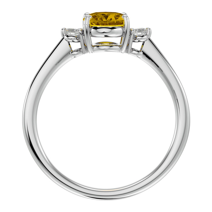 This citrine ring features one 8x6mm oval shape citrine gemstone. It is surrounded by two sparkling diamonds totaling 1/10 carat in I-J color, I1-I2 clarity. Total carat weight is approximately 1 1/3 carats. This ring is in sterling silver.