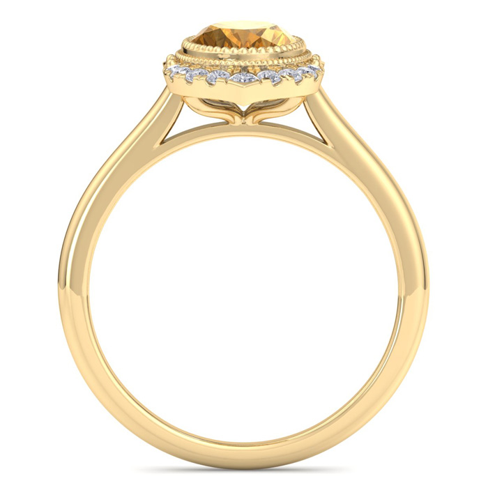 This gemstone ring features one 8x6mm oval shape citrine gemstone weighing approximately 1 carat. There are 18 sparkling diamonds in I-J color, I1-I2 clarity totaling approximately 1/5 carat. Total carat weight is 1 1/5 carats. This ring is in 14 karat yellow gold.