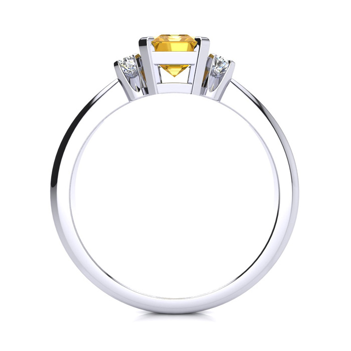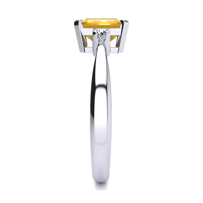 This citrine ring features one 9x7mm emerald cut citrine gemstone. It is surrounded by two sparkling diamonds totaling 1/10 carat in I-J color, I1-I2 clarity. Total carat weight is approximately 2.60 carats. This ring is in sterling silver.