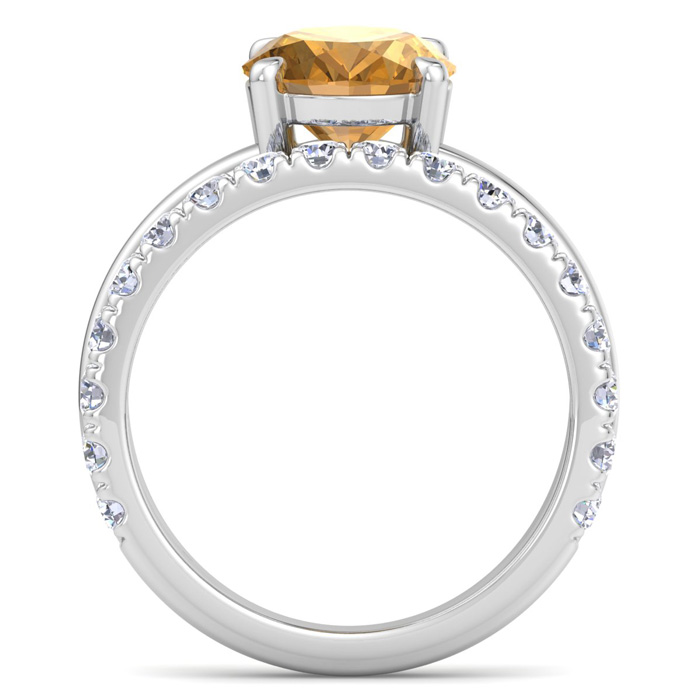 This elegant gemstone ring features one 10x8mm oval shape citrine gemstone at approximately 2 1/3 carats. It is surrounded by 18 sparkling diamonds in I-J color, I1-I2 clarity at 1/2 carat total weight. Total gem weight is approximately 2 3/4 carats. This ring is in 14 karat white gold.