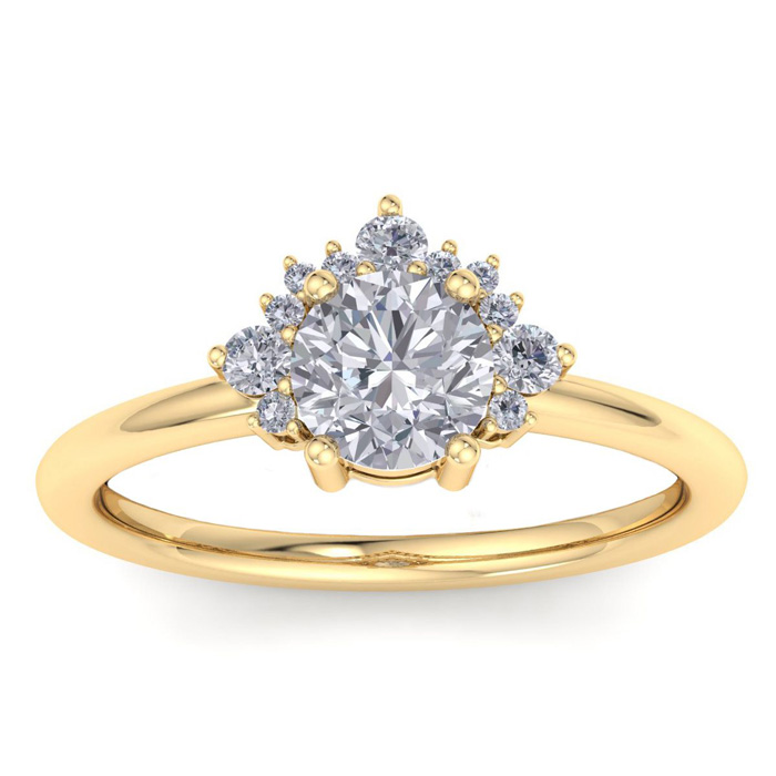 This unique engagement ring features a 0.80 carat clarity enhanced center diamond. It is accented with a crown of 11 diamonds in I-J color, I1-I2 clarity. Total carat weight is approximately 1 carat. This ring is in 14 karat yellow gold.