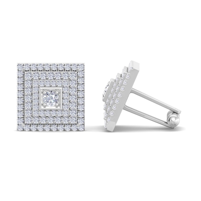 These cufflinks for men feature 162 sparkling lab grown diamonds in G-H color, VS clarity. Total carat weight is 3 1/2 carats. These cufflinks are in 14 karat white gold. Each cufflink measures approximately 3/4 inch.