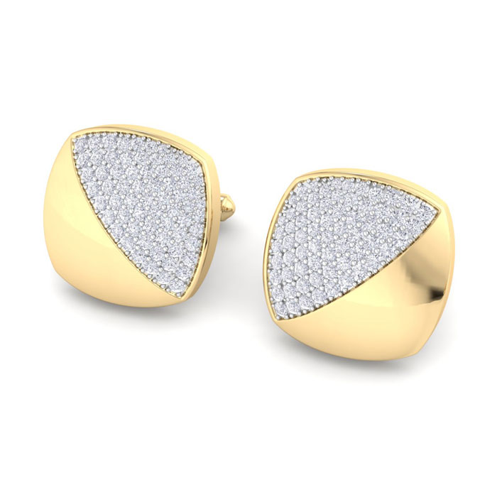These cufflinks for men feature 264 sparkling lab grown diamonds in G-H color, VS clarity. Total carat weight is 3 1/2 carats. These cufflinks are in 14 karat yellow gold. Each cufflink measures approximately 3/4 inch.