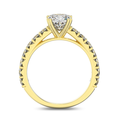 This classic engagement ring stuns with a cushion cut diamond that is fastened in with a double prong setting. The center diamond measures approximately 6mm at 1.00 carats. There are 14 diamonds along the band totaling at 0.56 carats. Total gem weight of the ring is approximately 1.56 carats in H-I color, SI2-I1 clarity. This ring is in 14 karat yellow gold.