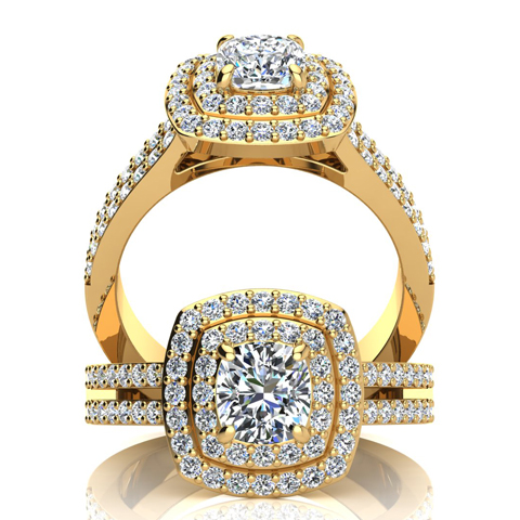 1 1/2 Carat Natural Double Halo Cushion Cut Diamond Engagement Ring in 14 Karat Yellow Gold