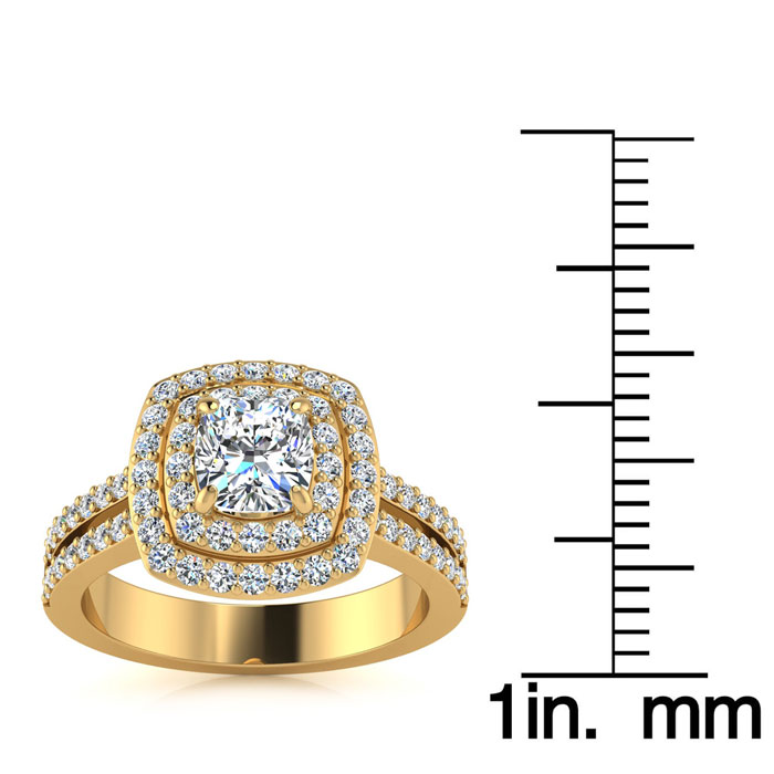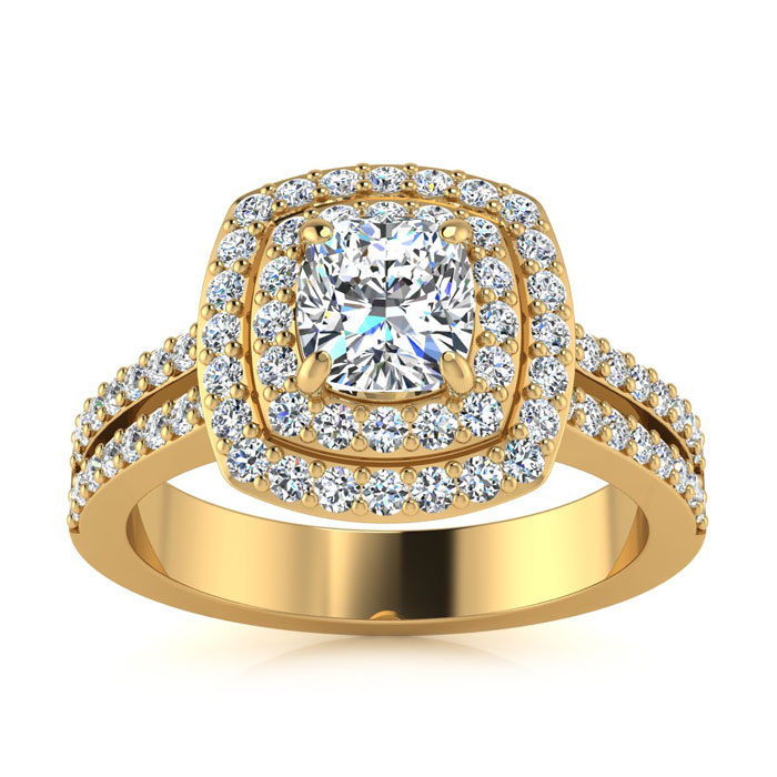 1 1/2 Carat Natural Double Halo Cushion Cut Diamond Engagement Ring in 14 Karat Yellow Gold