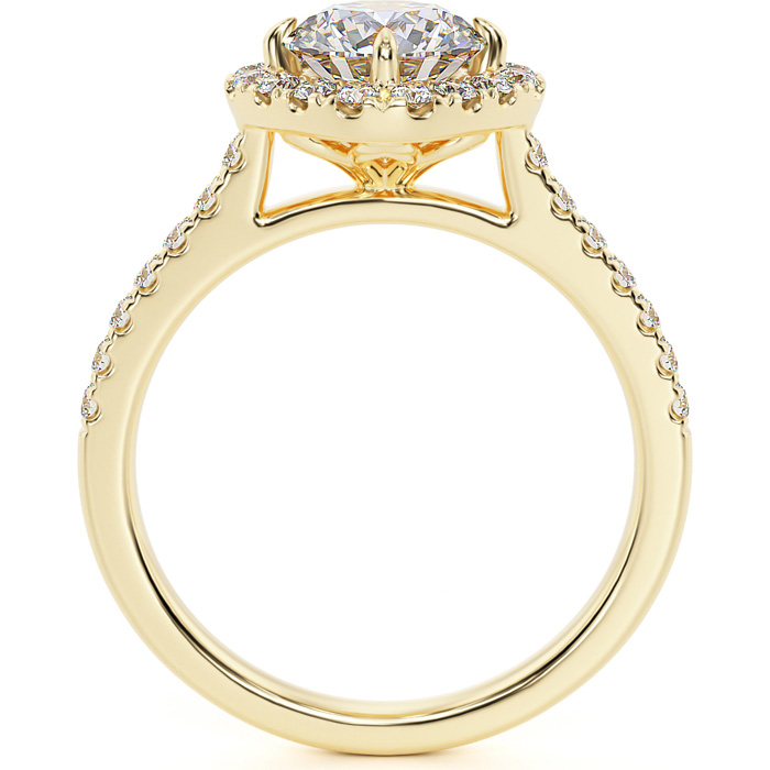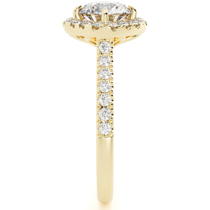 This halo diamond engagement ring stuns with a round shape center diamond that measures approximately 6.2mm at 1.00 carats. There are 30 diamonds in a halo and along the band totaling at 0.30 carats. Total gem weight of the ring is approximately 1.30 carats in H-I color, SI2-I1 clarity. This ring is in 14 karat yellow gold.