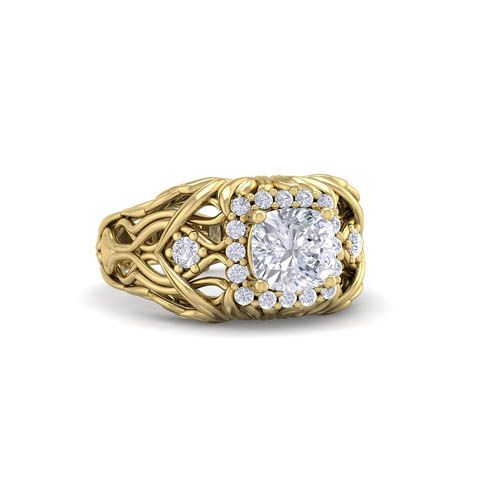 1 1/5 Carat Natural Cushion Cut Halo Diamond Intricate Vine Engagement Ring In 14 Karat Yellow Gold