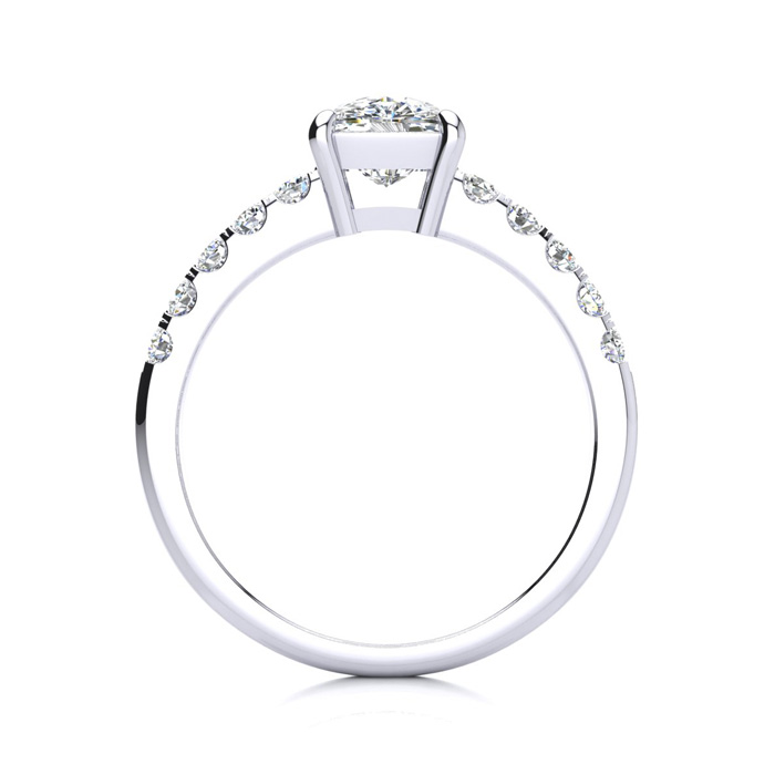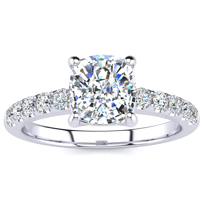 The perfect and most traditional diamond engagement ring for the lady who wants a diamond ring that is always in style. Featuring a cushion cut brilliant 1 1/2 carat clarity enhanced solitaire diamond and 10 side diamonds of 3 points each, this ring is 1.80 carats total diamond weight, set in solid 14 karat white gold. Available in ring sizes from 4 to 9.5.