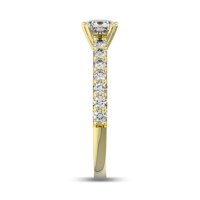 This classic engagement ring stuns with a cushion cut diamond that is fastened in with a double prong setting. The center diamond measures approximately 4.7mm at 0.50 carats. There are 14 diamonds along the band totaling at 0.42 carats. Total gem weight of the ring is approximately 0.92 carats in H-I color, SI2-I1 clarity. This ring is in 14 karat yellow gold.