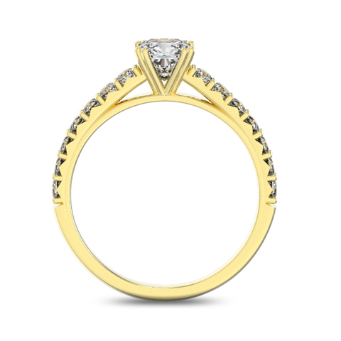 This classic engagement ring stuns with a cushion cut diamond that is fastened in with a double prong setting. The center diamond measures approximately 4.7mm at 0.50 carats. There are 14 diamonds along the band totaling at 0.42 carats. Total gem weight of the ring is approximately 0.92 carats in H-I color, SI2-I1 clarity. This ring is in 14 karat yellow gold.