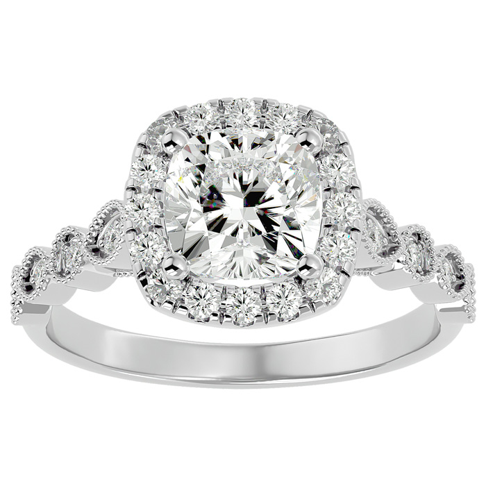 This fabulous diamond engagement ring features a sparkling 2 carat cushion cut center diamond in H-I color, SI2-I1 clarity. It is surrounded by 42 side diamonds totaling 1/2 carat. Total carat weight is 2 1/2 carats. This ring is in 14 karat white gold.