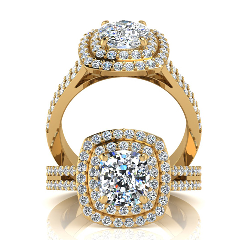 2 1/2 Carat Natural Double Halo Cushion Cut Diamond Engagement Ring in 14 Karat Yellow Gold