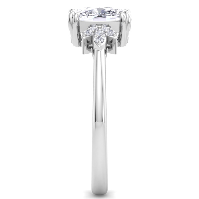 This unique engagement ring features a 2 carat elongated cushion cut center diamond. It is accented with 12 round diamonds in H-I color, SI2-I1 clarity. Total carat weight is approximately 2.07 carats. This ring is in 14 karat white gold.