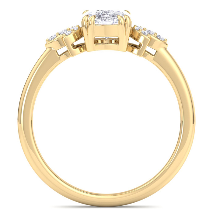 This unique engagement ring features a 2 carat elongated cushion cut clarity enhanced center diamond. It is accented with 12 round diamonds in I-J color, I1-I2 clarity. Total carat weight is approximately 2.07 carats. This ring is in 14 karat yellow gold.