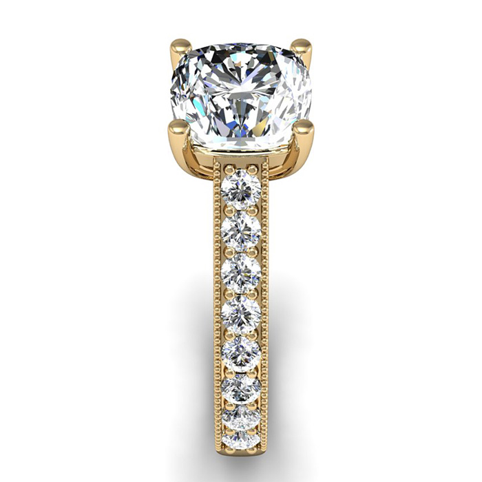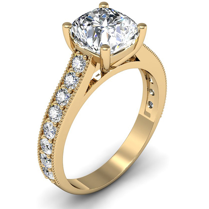Beautiful traditional and timeless diamond engagement ring that will make any bride happy. With 2.00 carats of fiery diamonds, this engagement ring includes a 1.50 carat clarity enhanced cushion cut center diamond and 16 shimmering diamonds set in milgrain channels on the band. White I-J color diamonds of I1-I2 clarity and mounted in 14k yellow gold.