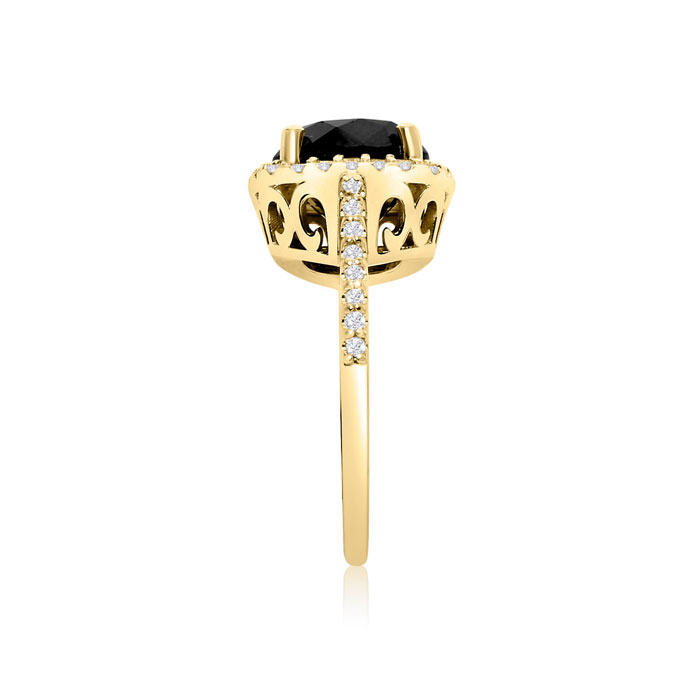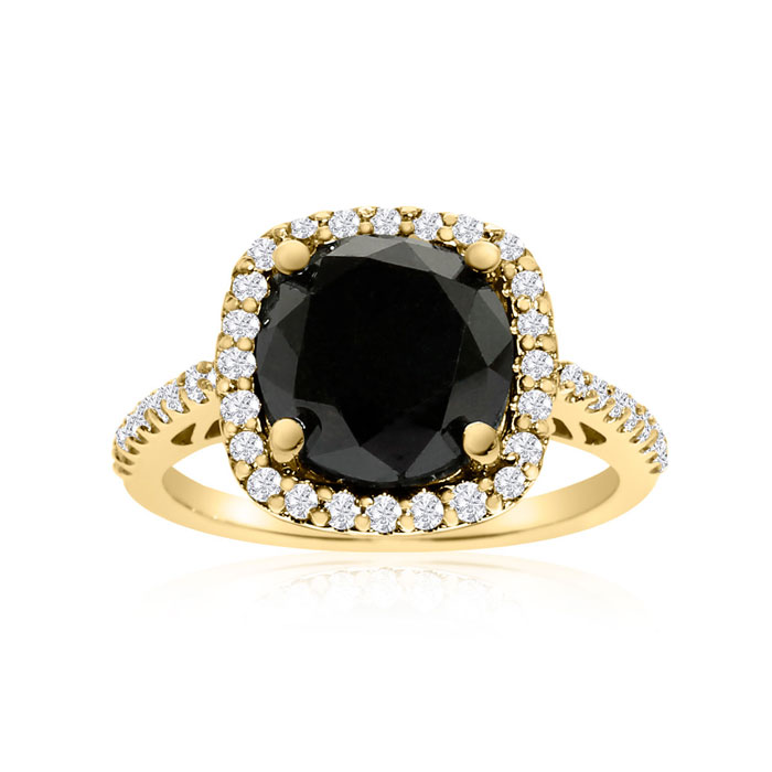 This ring features a GIGANTIC cushion cut black diamond weighing approximately 4 1/4 carats in I3 clarity. It measures 9x9mm. This black diamond is surrounded by 40 sparkling diamonds in G-H color, I1-I2 clarity at 0.36 carats total. Total gem weight is approximately 4.60 carats. This ring is in 14 karat yellow gold. The ring top measures 13x13mm, just about 1/2 inch.