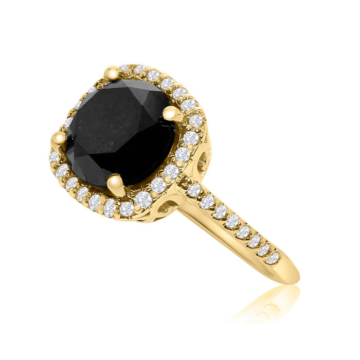 4 1/2 Carat Cushion Cut Black and White Diamond Halo Ring in 14 Karat Yellow Gold