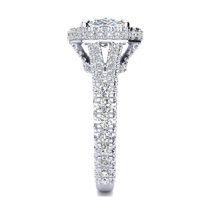 This massive diamond engagement ring is a show stopper. This ring features a 3 carat cushion cut center lab grown diamond in G color. There are 186 sparkling side diamonds down the band and in a halo in VS2 clarity at approximately 1.50 carats. Total gem weight is approximately 4.50 carats. This ring is in 14 karat white gold. Ring top measures 12x12mm.