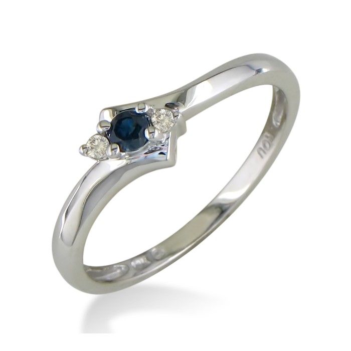 A lovely sapphire and diamond ring that is on the smaller side. Featuring 2 round brilliant cut side diamonds and a deep blue center sapphire, this ring will not overpower. Either for your small hands or for her first birthstone ring, crafted in 10 karat white gold. Solid made for long and tough wear.