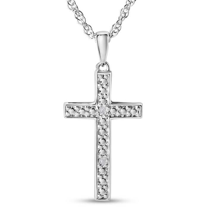 This diamond cross necklace features one sparkling diamond in J-K color, I2-I3 clarity weighing 0.02 carats. This cross is just over 1/2 inch long. This necklace is in platinum over brass and comes with an 18 inch chain with a spring-ring clasp.
