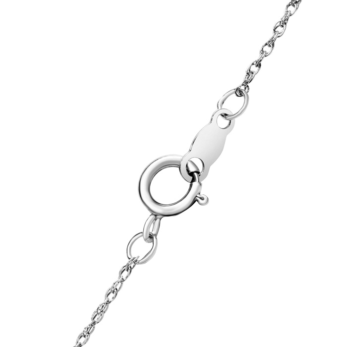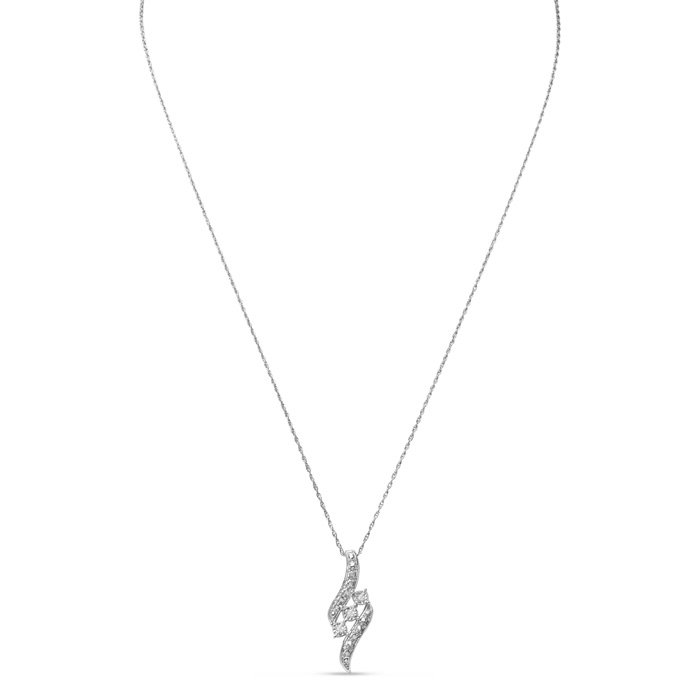 This modern diamond necklace features 4 sparkling diamonds in H-I color, I2-I3 clarity. The pendant measures 1 inch long. This necklace is in sterling silver and has an 18 inch cable chain with a spring-ring clasp.