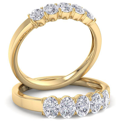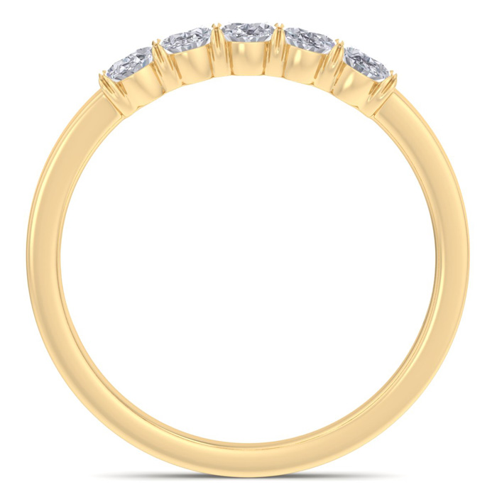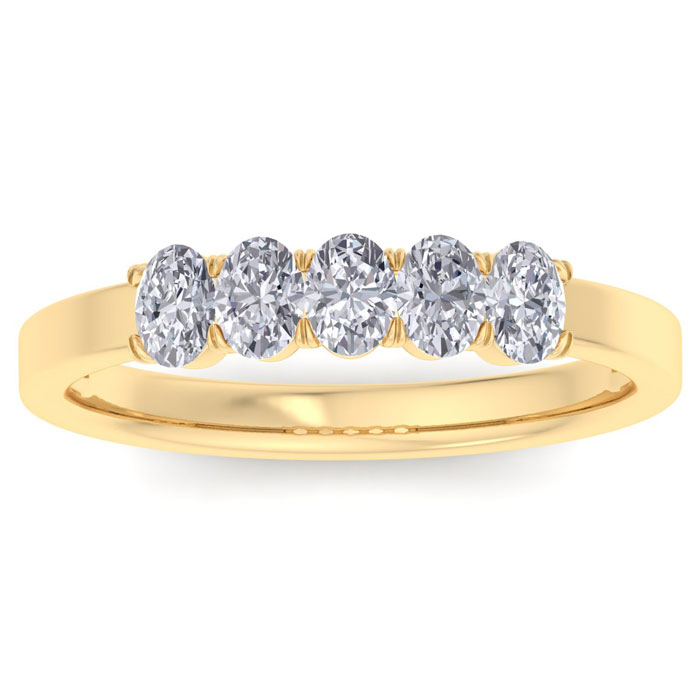 This oval diamond band ring features 5 oval shape diamonds each weighing approximately 1/10 carat I-J color, I1-I2 clarity. Total carat weight is approximately 1/2 carat. This ring is in 14 karat yellow gold.