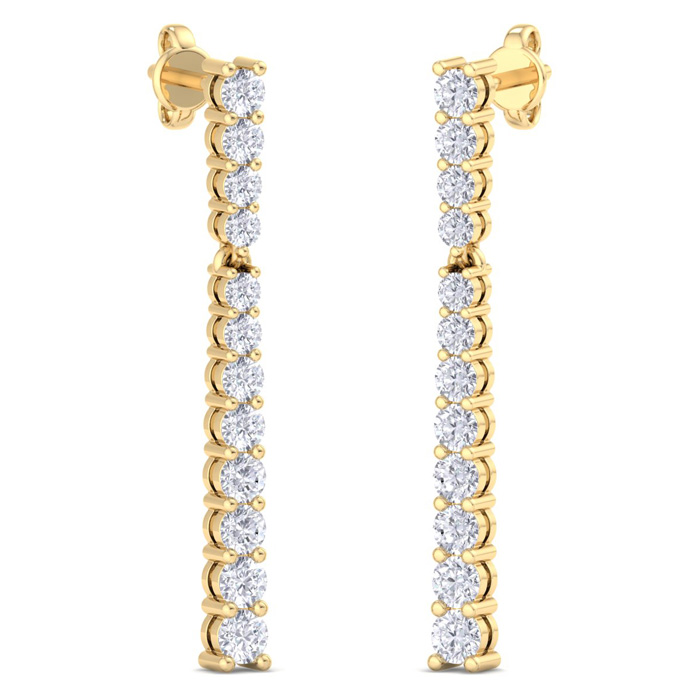 These fabulous diamond earrings feature 24 sparkling lab grown diamonds in G-H color, VS clarity. Total carat weight is 1 carat. These earrings are in 14 karat yellow gold and have secure post with friction backs. These bar earrings are just over 1 inch long.