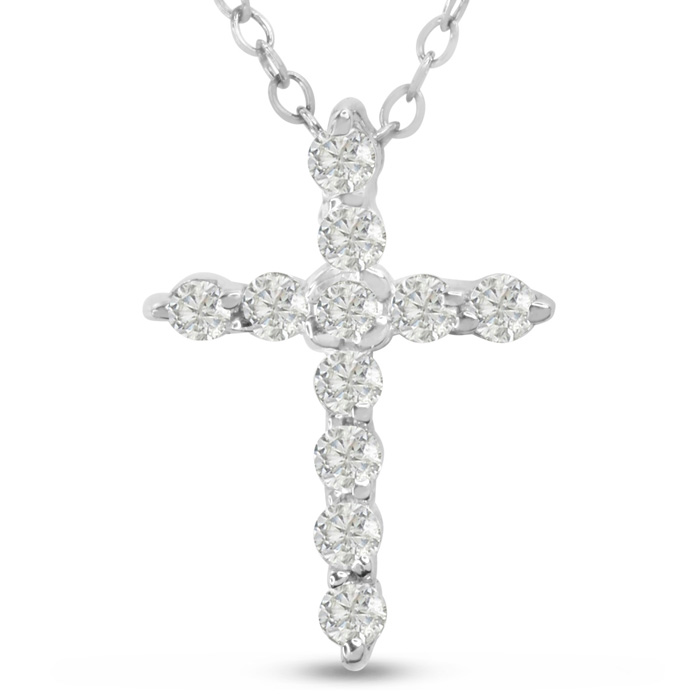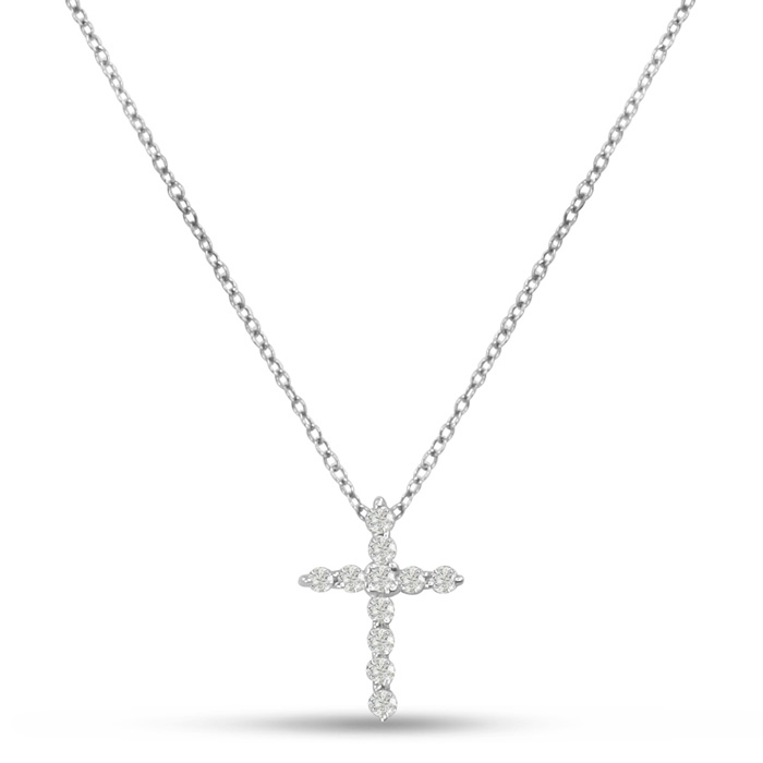 This classic lab grown diamond cross features 11 sparkling lab grown diamonds in G-H color, VS clarity. Total diamond weight is 2 3/4 carats. The cross is 3/4 inch long and 1/2 inch wide. Necklace is crafted in 14 karat white gold and comes with an 18 inch chain with spring ring clasp.