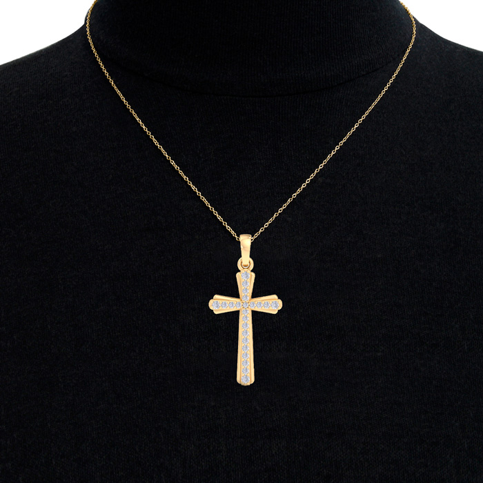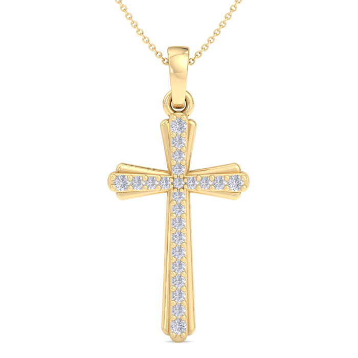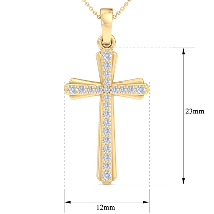 This diamond cross necklace features 23 sparkling lab grown diamonds adorning a cross that is approximately 1 inch long. Total carat weight is 0.15 carats. Diamond color is G-H, diamond clarity is VS. This necklace is in yellow gold plated sterling silver and comes with an 18 inch cable chain with a spring-ring clasp.