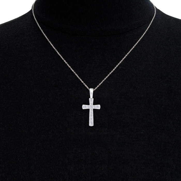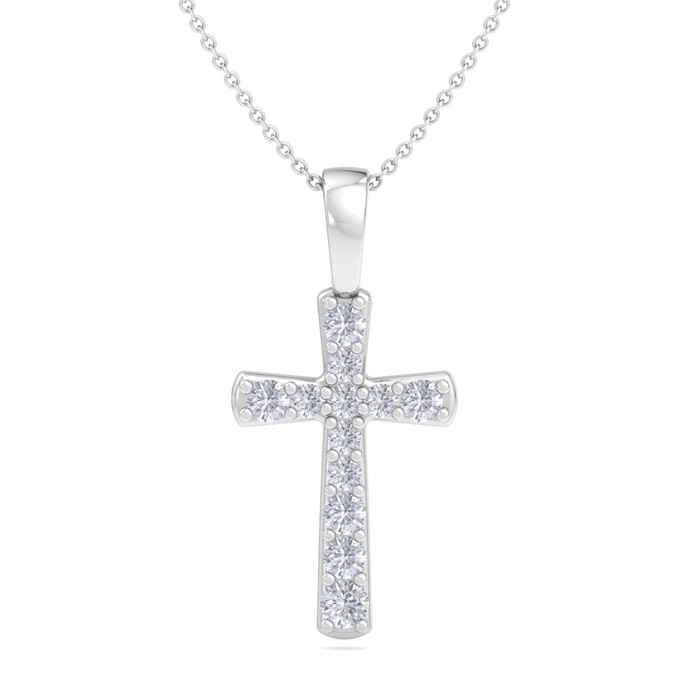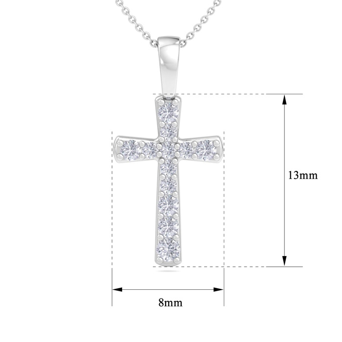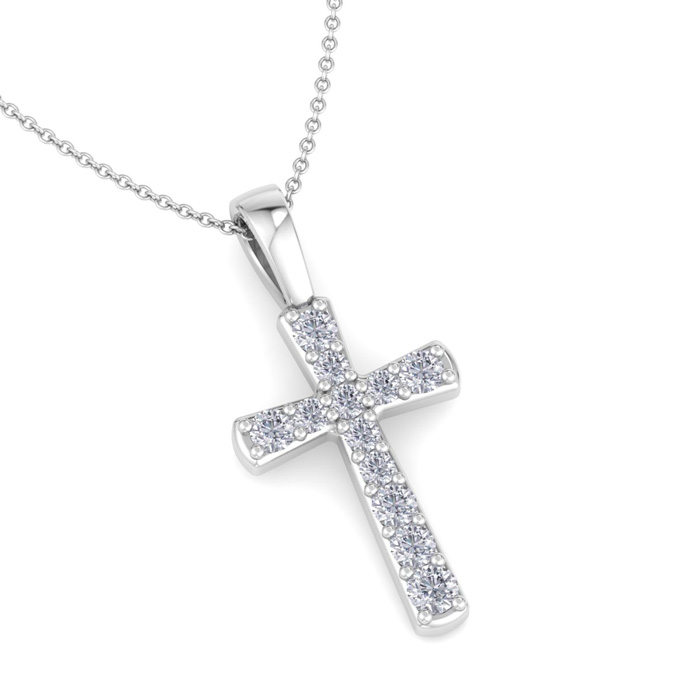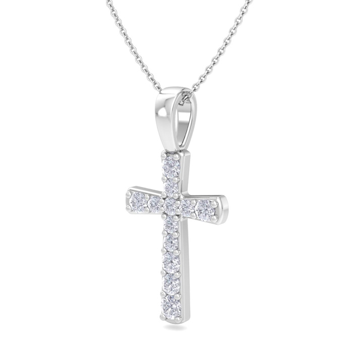This diamond cross necklace features 12 sparkling lab grown diamonds adorning a cross that is approximately 1/2 inch long. Total carat weight is 0.15 carats. Diamond color is G-H, diamond clarity is VS. This necklace is in sterling silver and comes with an 18 inch cable chain with a spring-ring clasp.