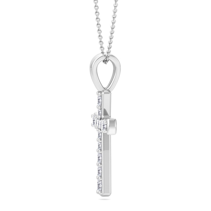 This diamond cross necklace features 12 sparkling lab grown diamonds adorning a cross that is approximately 1/2 inch long. Total carat weight is 0.15 carats. Diamond color is G-H, diamond clarity is VS. This necklace is in sterling silver and comes with an 18 inch cable chain with a spring-ring clasp.