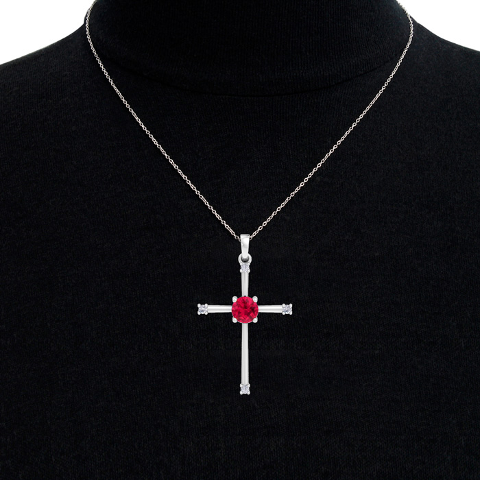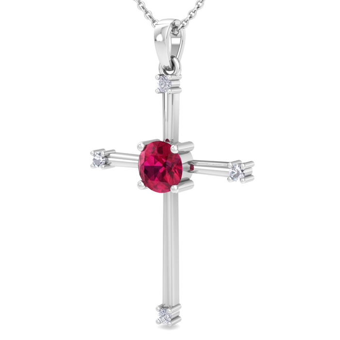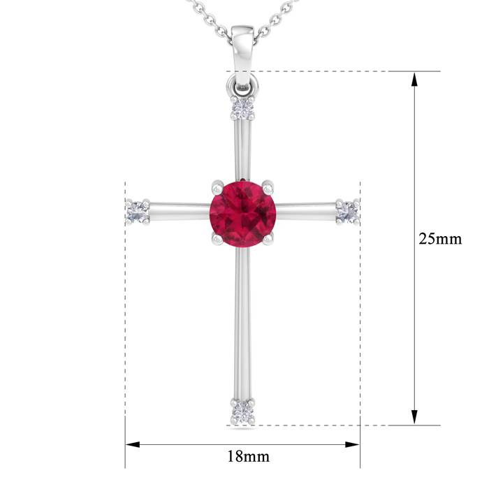 This diamond cross necklace features 1 ruby gemstone and 6 sparkling lab grown diamonds adorning a cross that is approximately 1 inch long. Total carat weight is 1/2 carat. Diamond color is G-H, diamond clarity is VS. This necklace is in sterling silver and comes with an 18 inch cable chain with a spring-ring clasp.