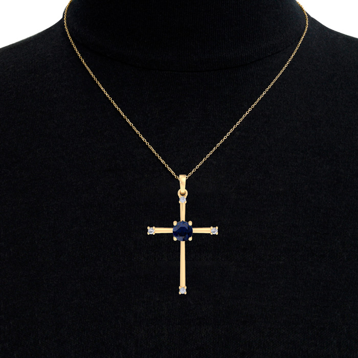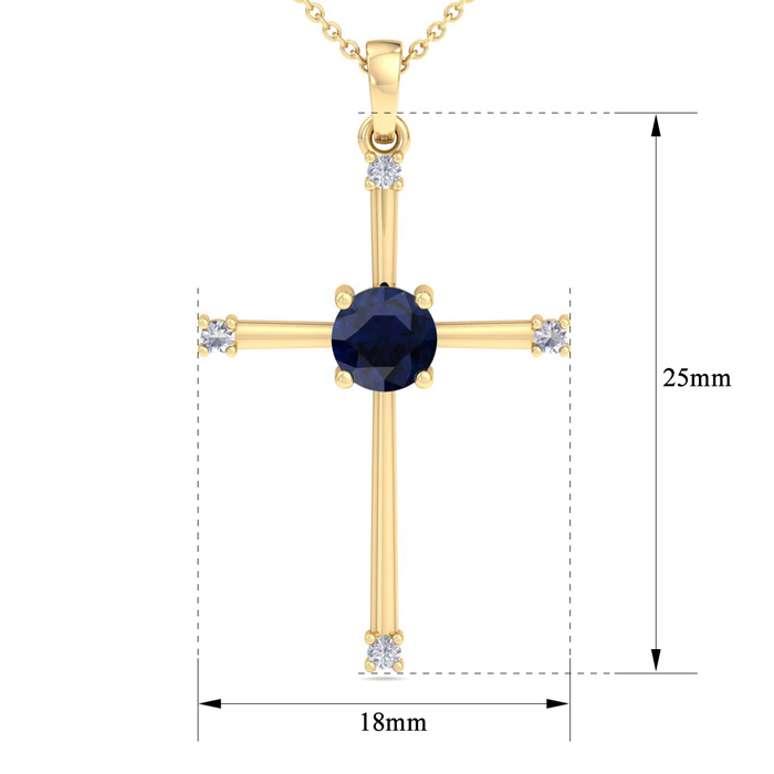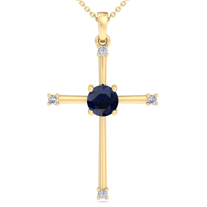 This diamond cross necklace features 1 sapphire gemstone and 6 sparkling lab grown diamonds adorning a cross that is approximately 1 inch long. Total carat weight is 1/2 carat. Diamond color is G-H, diamond clarity is VS. This necklace is in yellow gold plated sterling silver and comes with an 18 inch cable chain with a spring-ring clasp.