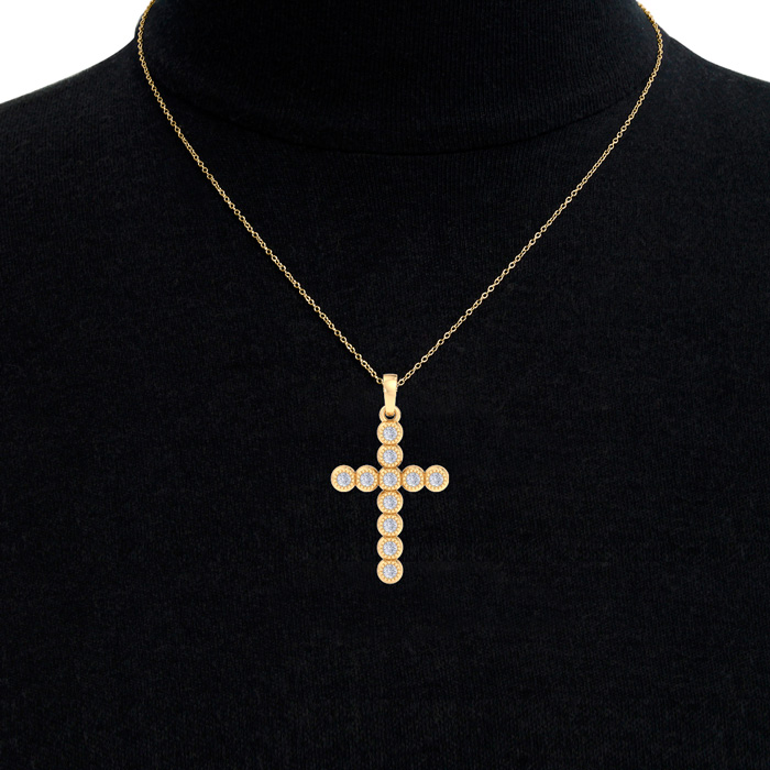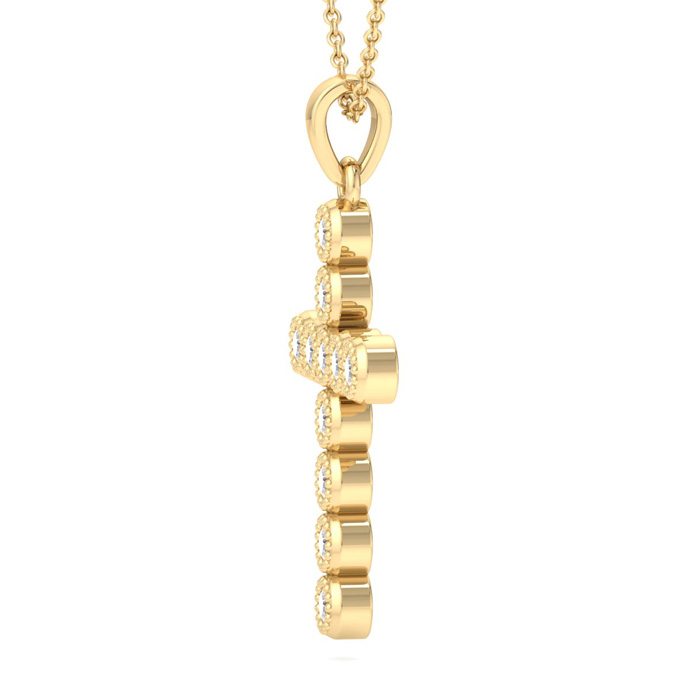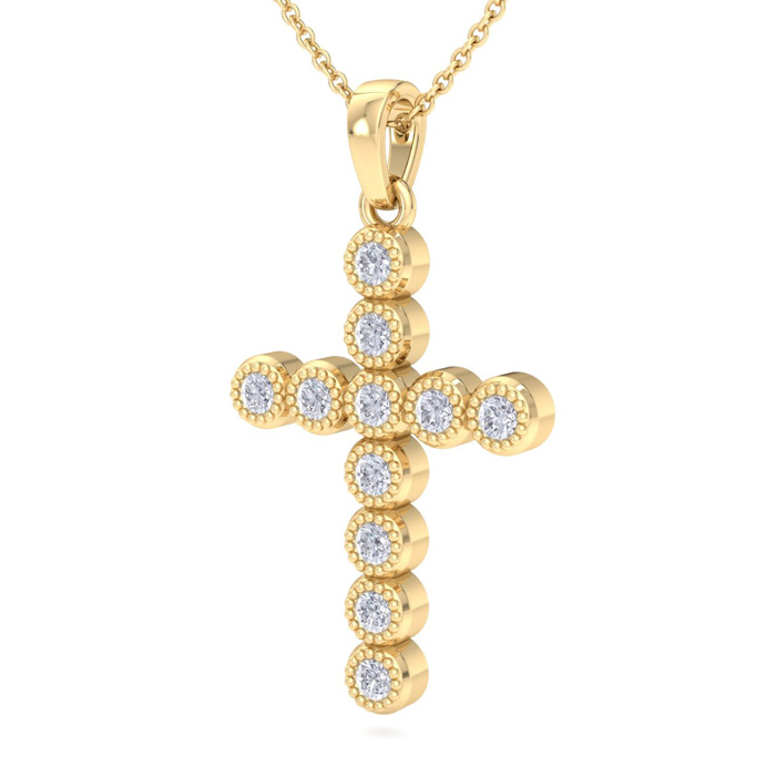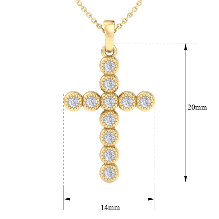 This diamond cross necklace features 11 sparkling lab grown diamonds adorning a cross that is approximately 3/4 inch long. Total carat weight is 1/5 carat. Diamond color is G-H, diamond clarity is VS. This necklace is in yellow gold plated sterling silver and comes with an 18 inch cable chain with a spring-ring clasp.