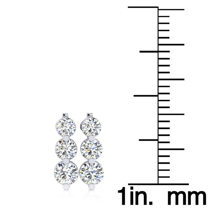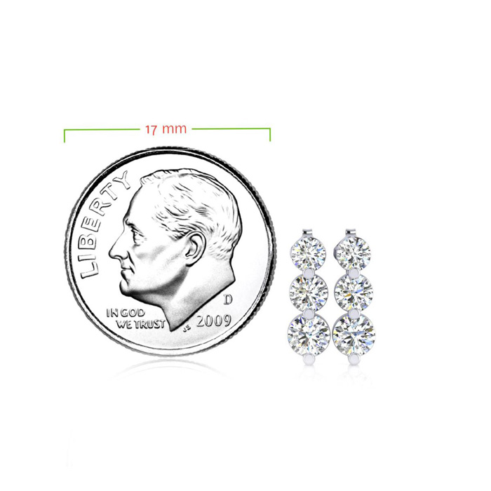 These earrings feature 6 round shape diamonds in I-J color, I1 clarity at 0.50 carats total. These earrings dangle down about 1/3 inch long. These earrings are in 14 karat white gold and have secure post with friction backs.