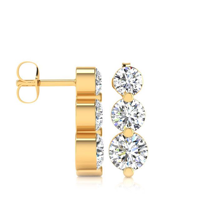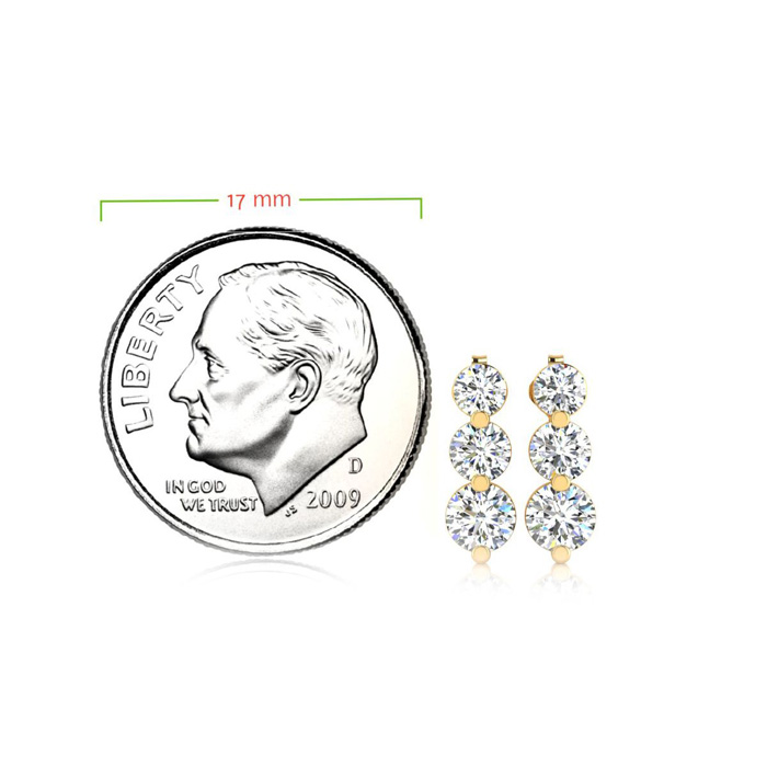 These earrings feature 6 round shape diamonds in I-J color, I1 clarity at 0.50 carats total. These earrings dangle down about 1/3 inch long. These earrings are in 14 karat yellow gold and have secure post with friction backs.