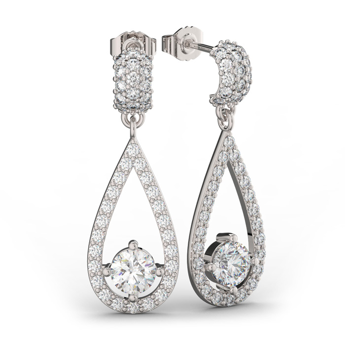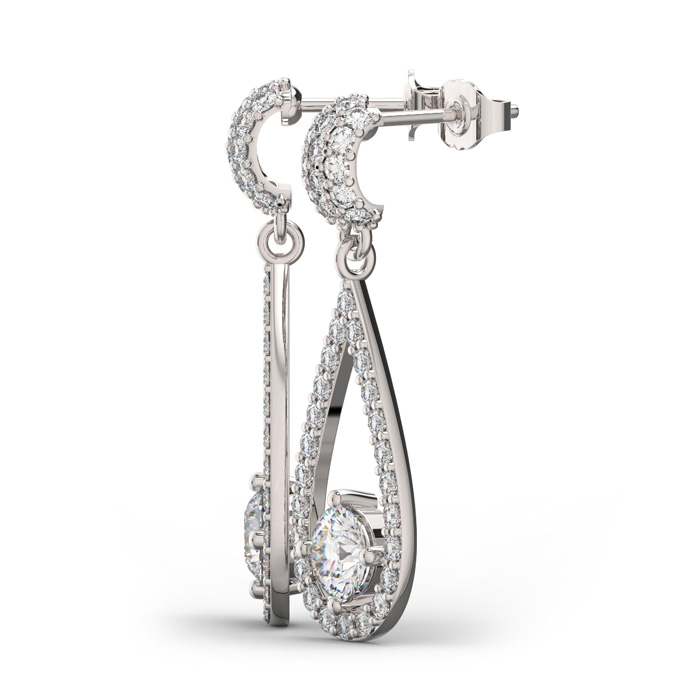 These 3 carat diamond earrings are a showstopper. Earrings feature 80 sparkling diamonds in I-J color, SI2-I1 clarity. Total carat weight is 3 carats. Each earring measures 1 inch long and 1/2 inch wide and is in 14 karat white gold with secure screwbacks. The center diamond in each earring is 3/4ct.