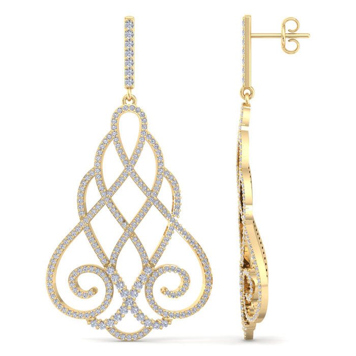 These fabulous diamond earrings feature 472 sparkling diamonds in I-J color, I2 clarity. Total carat weight is 2 1/3 carats. These earrings are in 14 karat yellow gold and have secure post with friction backs. These chandelier earrings are 2 inches long.